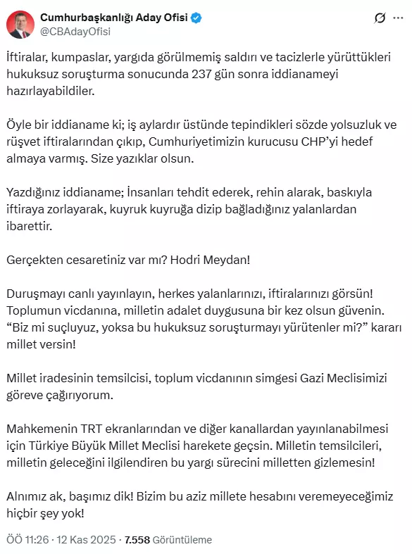 EKREM İMAMOĞLU'NDAN İLK TEPKİSilivri'de tutuklu bulunan Ekrem İmamoğlu ise "Cumhurbaşkanlığı Aday Ofisi" isimli hesaptan, hazırlanan İBB iddianamesine ilişkin ilk değerlendirmede bulundu. Duruşmaların TRT canlı olarak yayınlanmasını talep eden İmamoğlu, "Türkiye Büyük Millet Meclisi harekete geçsin. Alnımız ak, başımız dik" ifadelerini kullandı.