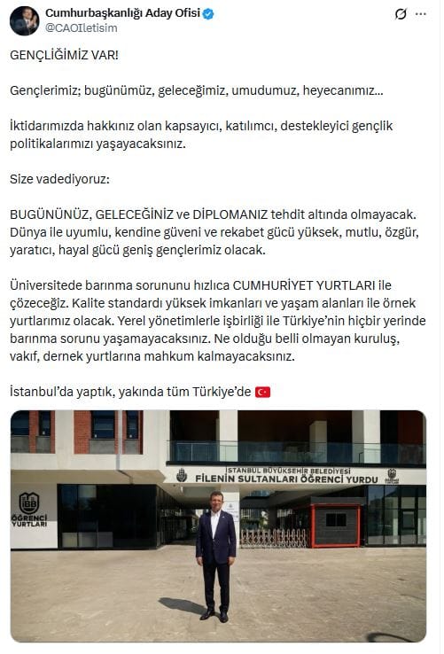 "VAKIF, DERNEK YURTLARINA MAHKUM KALMAYACAKSINIZ..."Sosyal medya platformu X'ten Cumhurbaşkanlığı Aday Ofisi hesabından bir paylaşım yapan İmamoğlu, 'Cumhuriyet Yurtları' projesini duyurdu. İmamoğlu'nun paylaşımında şu ifadelere yer verildi: