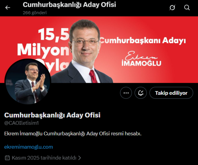 MİLLÎ GÜVENLİK GEREKÇESİYLE ENGELLENDİEngelliWeb'in aktardığı bilgilere göre, "CAOIletisim" kullanıcı adıyla faaliyet gösteren ve yaklaşık 209 bin takipçiye sahip "Ekrem İmamoğlu Cumhurbaşkanlığı Aday Ofisi" X hesabına, 5651 sayılı Kanun'un 8/A maddesi kapsamında erişim engeli getirildi. Kararın gerekçesi olarak ise millî güvenlik ve kamu düzeninin korunması gösterildi.