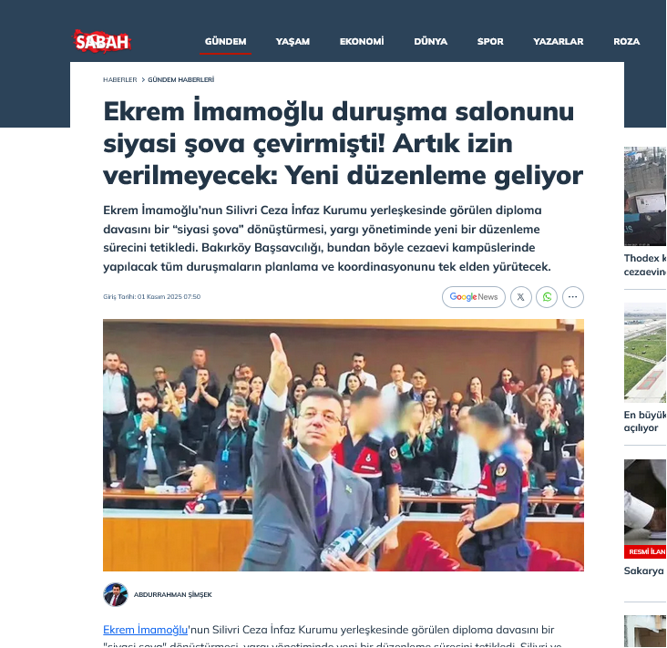 Bu soruşturmaya rağmen Sabah gazetesi İmamoğlu'nun duruşma anından fotoğraflarını haberinde yayımladı.