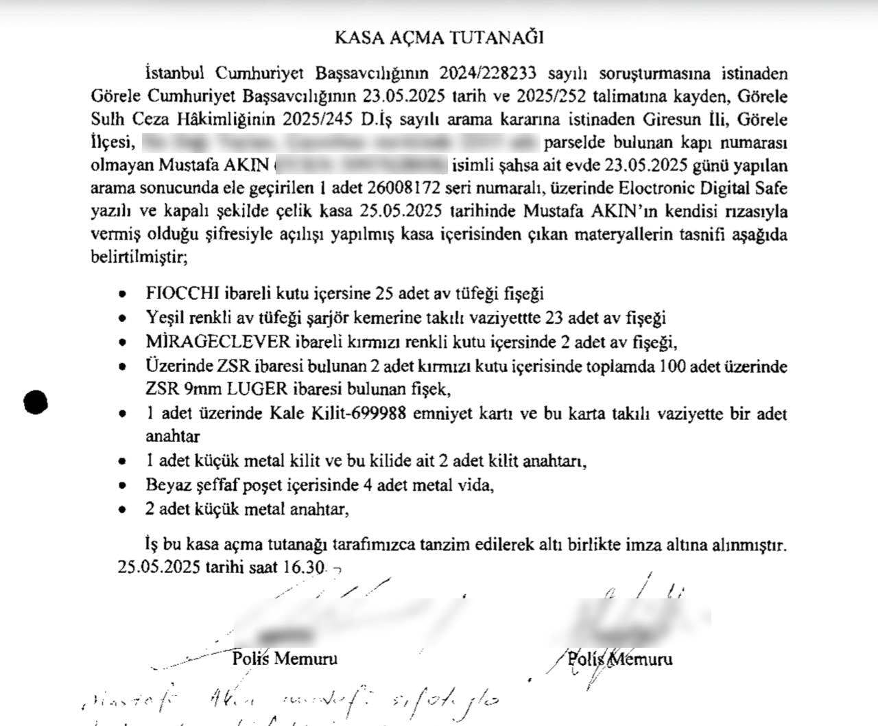 Tutanak, 25 Mayıs 2025 saat 16.30'da iki polis memuru tarafından tanzim edilerek imza altına alındı.