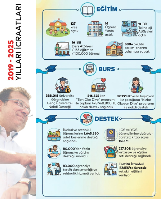 388 BİN ÜNİVERSİTELİYE BURS388 bin 18 üniversite öğrencisine nakdi destek, 'Sen oku diye' programı kapsamında 478 milyon 968 bin lira destek ve 39 bin 291 kız çocuğuna nakdi destek ile beraber LGS ve YGS öğrencilerine 116 bin ücretsiz kitap, 227 bin 308 öğrenciye kırtasiye eğitimi verildiğini kaydeden İmamoğlu notunu da şu şekilde yazdı: