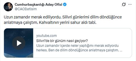 İmamoğlu YouTube'da yayımlanan videosunun duyurusunu sosyal medya hesabından, "Uzun zamandır merak ediliyordu. Silivri günlerimi dilim döndüğünce anlatmaya çalıştım. Kahvaltının yerini sahur aldı tabi." ifadeleri ile duyurdu.
