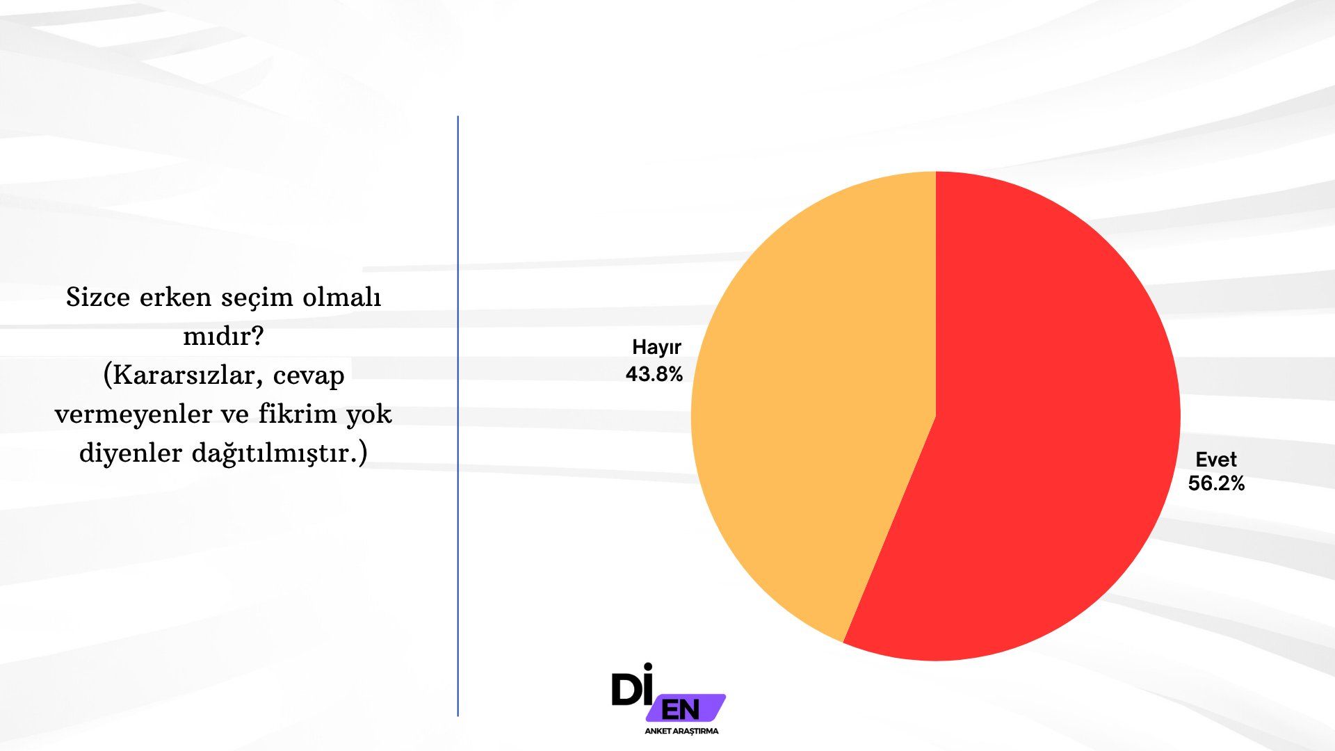 HALK ERKEN SEÇİM İSTİYORAnkete katılanlara yöneltilen "Sizce erken seçim olmalı mıdır?" sorusuna ise halkın çoğunluğu "Evet" yanıtını verdi. Kararsızların, cevap vermeyenlerin ve fikri olmadığını belirtenlerin dağıtılmasının ardından, katılımcıların yüzde 56,2'si erken seçim olması gerektiğini belirtirken, yüzde 43,8'i ise "Hayır" dedi.