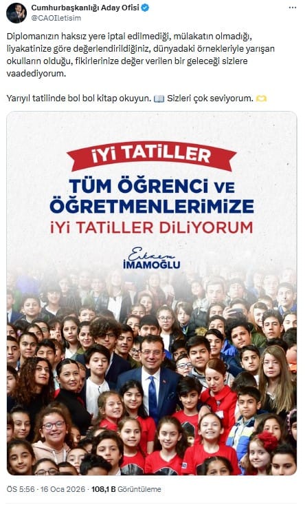 İBB Başkanı ve CHP'nin tutuklu Cumhurbaşkanı adayı Ekrem İmamoğlu, yarıyıl tatiline giren öğretmen ve öğrenciler için Cumhurbaşkanlığı Aday Ofisi'nin sosyal medya hesabından mesaj yayımladı.