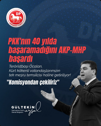 Demokrat Parti Genel Başkanı Gültekin Uysal, İmralı Süreci kapsamında kurulan TBMM Milli Birlik Dayanışma ve Demokrasi Komisyonu’nun bugün (21 Kasım) yapacağı toplantıda terör örgütü PKK'nın lideri Öcalan’la görüşme kararı çıkması hâlinde komisyondan çekileceklerini duyurdu. Uysal, yaptığı yazılı açıklamada sert ifadeler kullandı.