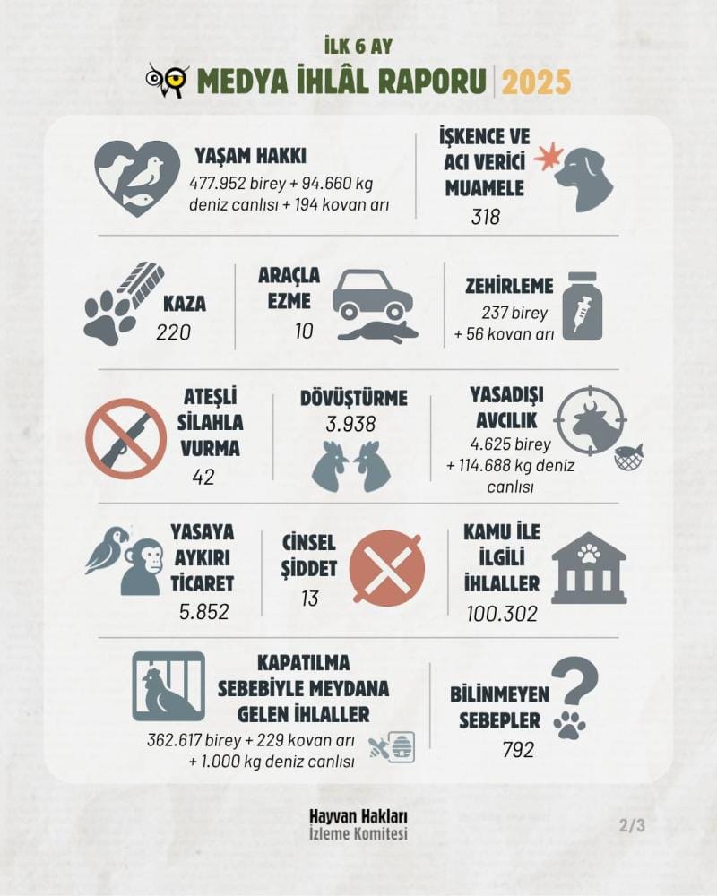 Hayvan Hakları İzleme Komitesi (HAKİM), 2025’in ocak-haziran dönemini kapsayan hayvan hakkı ihlalleri raporunu yayımladı. Sadece dijital basına yansıyan haberlerin değerlendirildiği rapora göre, ilk 6 ayda farklı türlerden en az 477 bin 952 hayvan yaşam hakkından mahrum bırakıldı.