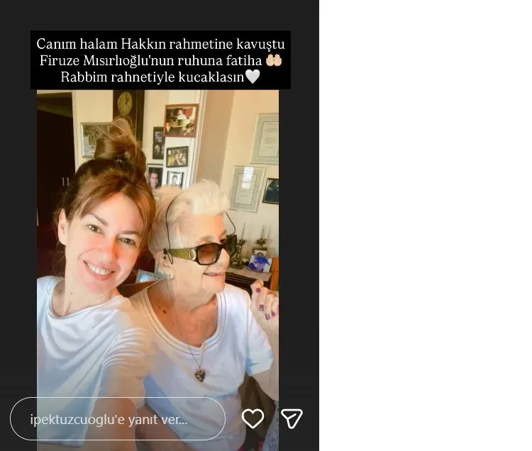 Paylaşımında halasıyla çekilmiş bir fotoğrafına yer veren sanatçı, "Canım halam Hakkın rahmetine kavuştu. Firuze Mısırlıoğlu’nun ruhuna Fatiha. Rabbim rahmetiyle kucaklasın" ifadelerini kullandı.