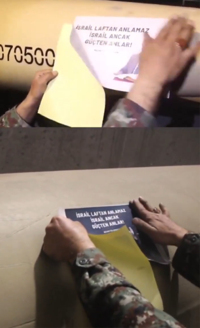 "İSRAİL ANCAK GÜÇTEN ANLAR"Görüntülerde askeri personelin, füzelerin üzerine Necmettin Erbakan’ın hafızalara kazınan "İsrail laftan anlamaz; İsrail ancak güçten anlar!" sözlerini hem Türkçe hem de Farsça dillerinde yapıştırdığı anlar yer alıyor.