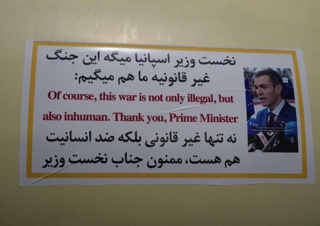 Farsça ve İngilizce olarak yazılan ve füzenin üzerine yapıştırılan notta, İspanya Başbakanı’nın savaşa karşı tutumu aktarılırken şu ifadelere yer verildi: