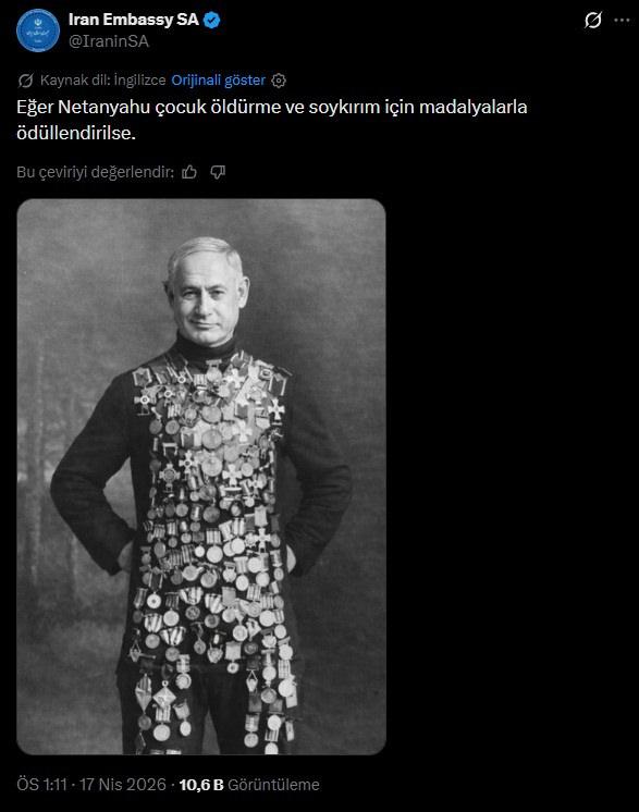 İran'ın Güney Afrika Büyükelçiliğinin resmi X hesabından dikkat çeken bir gönderi yayınlandı. Paylaşımda İsrail Başbakanı Binyamin Netanyahu'nun madalyalarla donatılmış bir görseline yer verildi. İran-İsrail gerilimi sürerken İsrailli Başbakanı ironik bir şekilde resmeden İran, şu açıklamada bulundu: