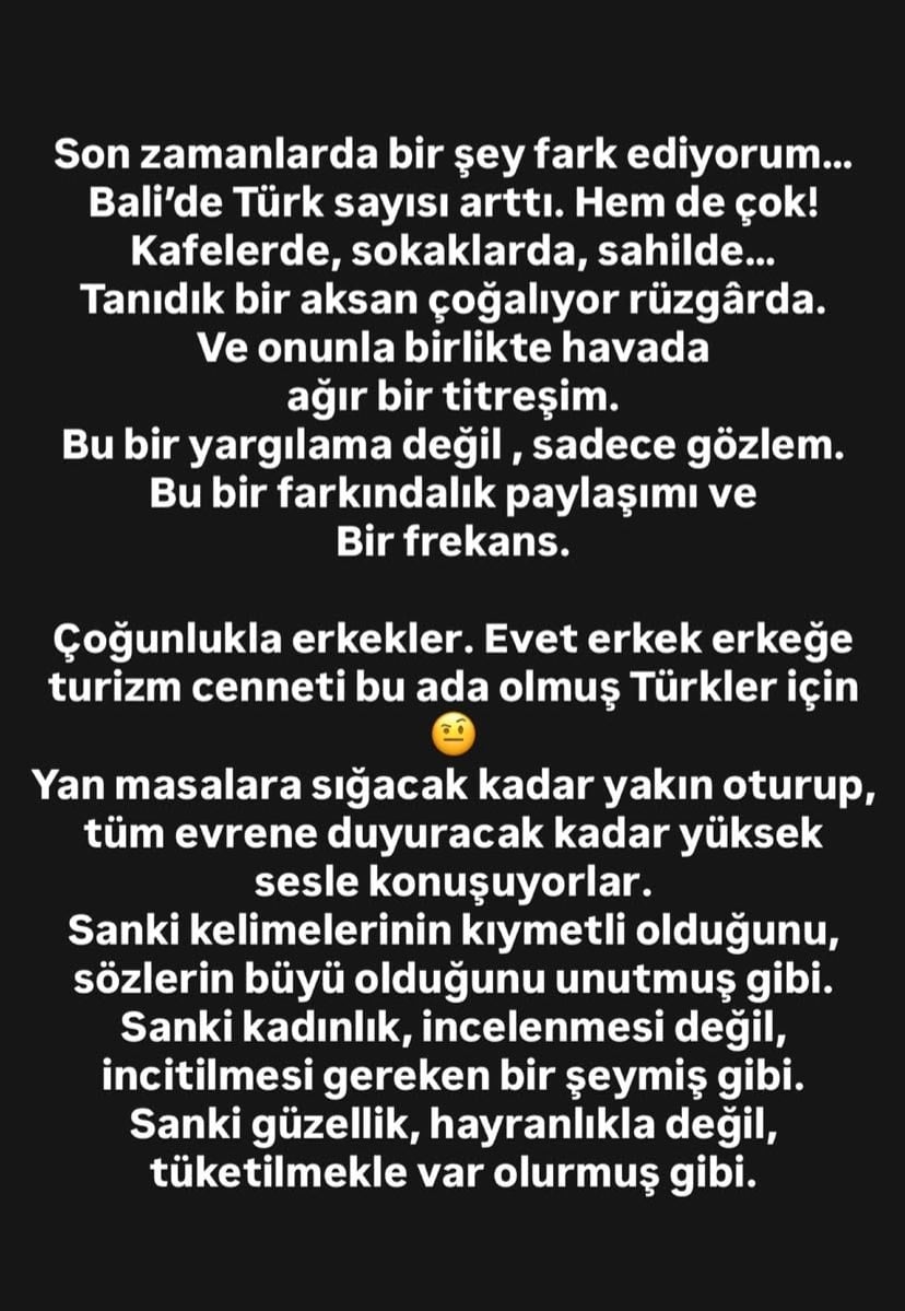 "Son zamanlarda bir şey fark ediyorum. Bali'de Türk sayısı arttı. Hem de çok! Kafelerde, sokaklarda, sahilde... Tanıdık bir aksan çoğaalıyor rüzgarda. Ve onunla birlikte havada ağır bir titreşim. Bu bir yargılama değil, sadece gözlem. Bu bir farkındalık paylaşımı. Bir frekans."