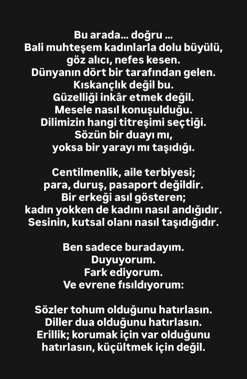 "Bu arada doğru... Evet Bali; muhteşem kadınlarla dolu büyülü, göz alıcı, nefes kesen bir yer. Ama centilmenlik, aile terbiyesi; para, duruş, pasaport değildir. Bir erkeği asil gösteren; kadın yokken de kadını nasıl andığıdır."