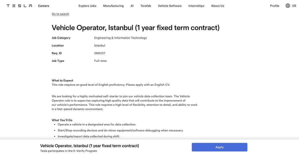 TESLA’DAN TÜRKİYE İÇİN FSD SİNYALİ Mİ?Tesla’nın resmi kariyer sayfasında yer alan “Vehicle Operator – Istanbul (1 year fixed term contract)” ilanında, "Araç veri toplama ekibimize katılacak, motivasyonu yüksek ve inisiyatif alabilen birini arıyoruz. Araç Operatörü pozisyonunun görevi, araçlarımızın performansının iyileştirilmesine katkıda bulunacak yüksek kaliteli verilerin toplanmasını denetlemektir. Bu pozisyon, yüksek düzeyde esneklik, detaylara özen ve hızlı tempolu, dinamik bir ortamda çalışma becerisi gerektiriyor." açıklaması yer alıyor.