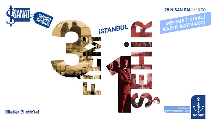 3 FİLM 1 ŞEHİR KONUŞMALARI BAŞLIYORİş Vapur’un etkinlik programı, Mehmet Kırali ve Kadir Kaymakçı’nın çeşitli şehirleri, beyazperdedeki yansımaları eşliğinde inceleyecekleri “3 Film 1 Şehir” ile başlıyor. Yönetmenler ve oyuncularla birlikte, şehrin ruhunda iz bırakan yapıların ve insanların hikâyeleri de bu sohbetlerin konusu oluyor. İstanbul’un konuşulacağı 28 Nisan Salı 18.30’daki ilk etkinliğin odağında Jules Dassin’in yönettiği “Topkapı” (1964), James Bond serisinden “From Russia with Love” (Rusya’dan Sevgilerle, 1963) ve Alain Robbe-Grillet’nin yönettiği “L’Immortelle” (Ölümsüz Kadın, 1963) filmleri yer alıyor.