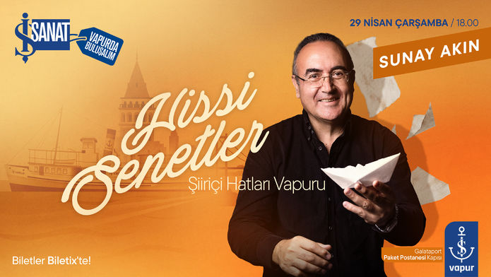 SUNAY AKIN İLE HİSSİ SENETLER “Hissi Senetler” sohbetleri ile İstanbul Boğazı’nın tarihine İş Vapur’un penceresinden bakıyoruz. 29 Nisan Çarşamba ve 8 Mayıs Cuma günleri 18.00’de düzenlenecek etkinliklerde, Şiiriçi Hatları Vapuru’nun kaptanı Sunay Akın, Boğaz’ın, vapurların ve İstanbul’un hissi senetlerini katılımcılarla paylaşıyor.