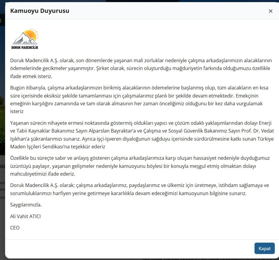 Ankara’da hakları için direnen Doruk Madencilik işçileri gündemdeyken, Yıldızlar SSS Holding’in CEO’su Ali Vahit Atıcı’nın geçmiş görevleri dikkat çekti. Ali Vahit Atıcı'nın uzun yıllar Hazine Bakanlığı'nda danışmanlık, AKP iktidarının yakınlığı ile bilenen TÜGVA'da Bayburt il başkanlığı yaptığı ve 2023'te AKP'den vekillik için aday adaylığı bulunduğu görüldü. Atıcı, aynı zamanda 2023'teki seçimlerde de Saray'daki kutlamalarda yer almış.