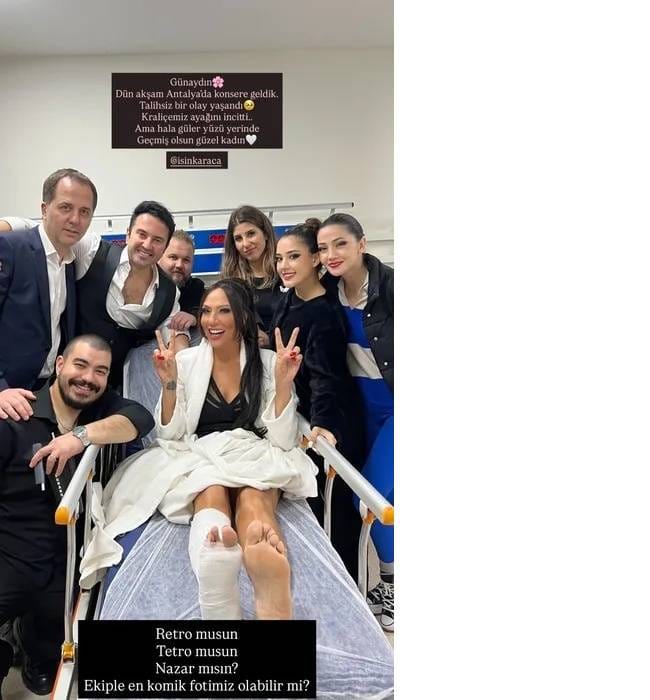 Ünlü şarkıcı, hasta yatağında bileği sargılı bir şekilde poz verirken, fotoğrafı paylaşan arkadaşı "Dün akşam Antalya'da konsere geldik. Talihsiz bir olay yaşandı. Kraliçemiz ayağını incitti. Ama yine güler yüzü yerinde. Geçmiş olsun güzel kadın" ifadelerine yer verdi.