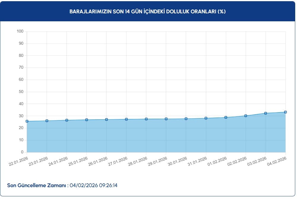 İSTANBUL BARAJLARI ÜÇ GÜNDE DOLDUİstanbul’un baraj doluluk oranı son üç gün içinde istikrarlı bir yükseliş gösterdi. 3 Şubat’ta yüzde 32,30 olan doluluk oranı, 4 Şubat’ta yüzde 33,27’ye, 5 Şubat itibarıyla ise yüzde 33,73’e yükseldi. Böylece barajlarda 3 günde toplam 1,43 puanlık artış kaydedilmiş oldu. Uzmanlar, bu yükselişte kent genelindeki yağışların ve yüksek kesimlerdeki kar erimelerinin etkili olduğunu belirtti. Yaşanan artış, İstanbul’un su rezervleri açısından umut verici bir tablo oluşturdu.