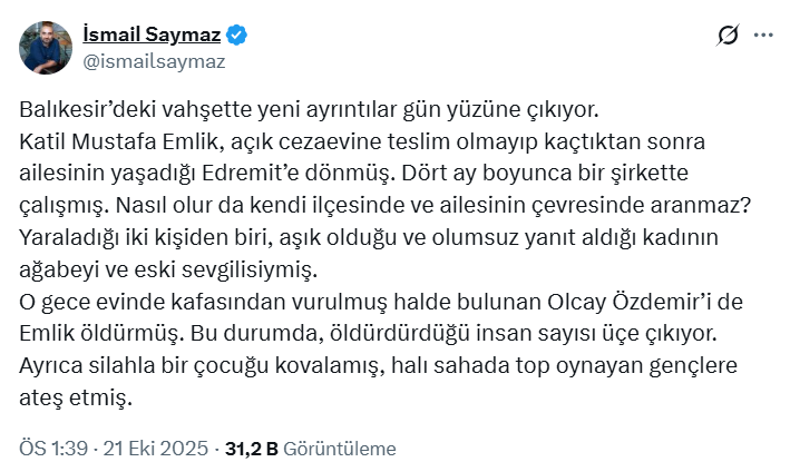 Halktv.com.tr yazarı İsmail Saymaz, Edremit'teki o geceye ilişkin dikkat çeken bir paylaşımda bulundu. "Nasıl olur da kendi ilçesinde ve ailesinin çevresinde aranmaz?" diye soran Saymaz'ın sosyal medya hesabından yaptığı paylaşımda, "Balıkesir’deki vahşette yeni ayrıntılar gün yüzüne çıkıyor. Katil Mustafa Emlik, açık cezaevine teslim olmayıp kaçtıktan sonra ailesinin yaşadığı Edremit’e dönmüş. Dört ay boyunca bir şirkette çalışmış. Nasıl olur da kendi ilçesinde ve ailesinin çevresinde aranmaz? Yaraladığı iki kişiden biri, aşık olduğu ve olumsuz yanıt aldığı kadının ağabeyi ve eski sevgilisiymiş. O gece evinde kafasından vurulmuş halde bulunan Olcay Özdemir’i de Emlik öldürmüş. Bu durumda, öldürdürdüğü insan sayısı üçe çıkıyor. Ayrıca silahla bir çocuğu kovalamış, halı sahada top oynayan gençlere ateş etmiş" ifadeleri yer aldı.