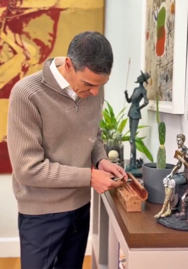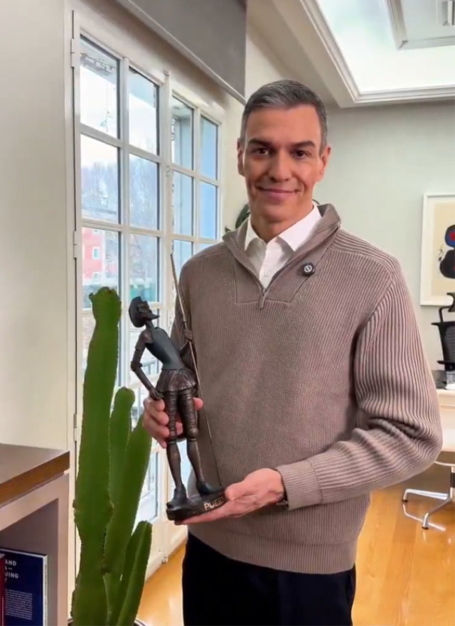 DON KİŞOT KOLEKSİYONU DİKKAT ÇEKTİBaşbakanın ofisinde yer alan bir diğer dikkat çekici detay ise Don Kişot figürleri oldu. Sánchez, İspanyol edebiyatının simge karakterlerinden biri olan Don Kişot’a özel bir ilgisi olduğunu ve yıllardır bu figürleri koleksiyon haline getirdiğini dile getirdi.