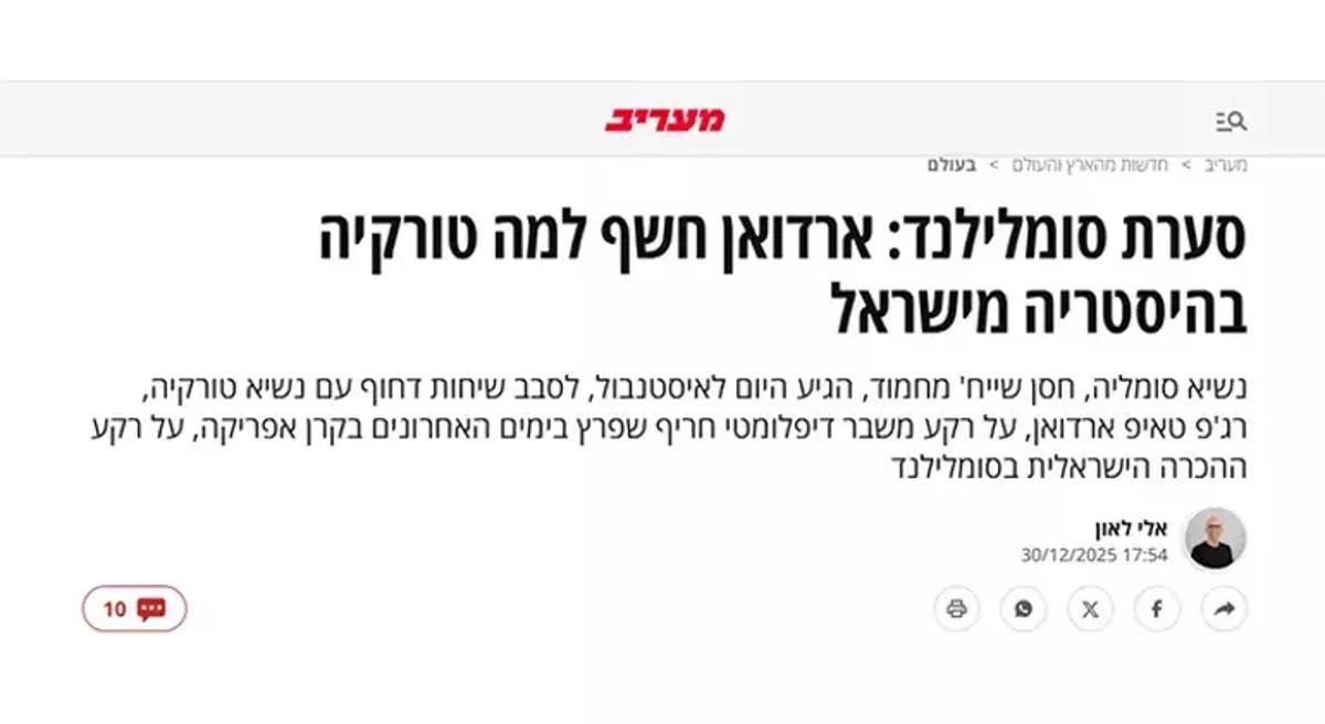 İsrail yönetiminin, Somali'nin toprak bütünlüğünü hedef alarak ayrılıkçı Somaliland bölgesini tanıması ve Afrika Boynuzu'nda yeni bir kaos planını devreye sokması, Türkiye'nin kararlı duruşuyla karşılaştı. Somali Cumhurbaşkanı Hasan Şeyh Mahmud'un, Cumhurbaşkanı Recep Tayyip Erdoğan'ın daveti üzerine Ankara'ya gelmesi ve iki liderin verdiği birlik mesajları, Tel Aviv medyasında geniş yankı uyandırdı. İsrail basını, Türkiye'nin bölgedeki oyun kurucu rolünü ve İsrail'in planlarına vurduğu darbeyi itiraf etmek zorunda kaldı.