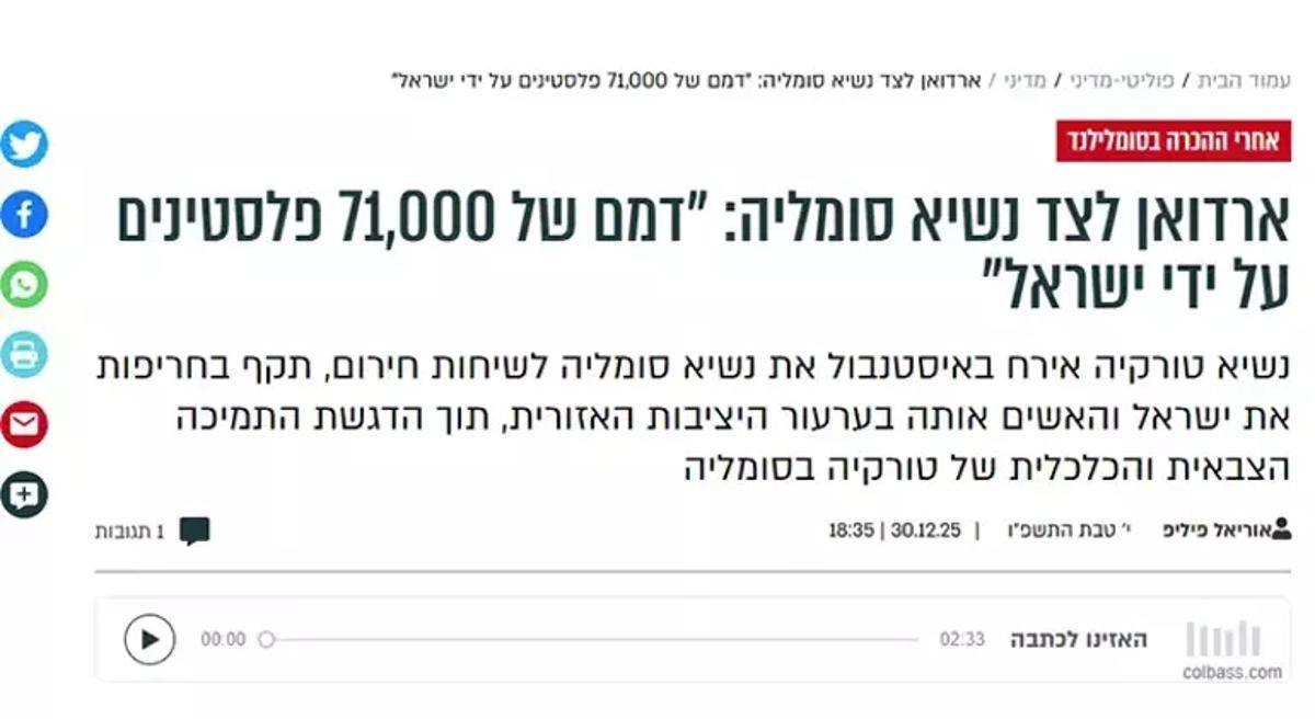 Bhol haber sitesi ise Türkiye'nin Somali'nin en yakın müttefiki olduğu gerçeğinin altını çizdi. Haberde, Cumhurbaşkanı Erdoğan'ın 71 bin Filistinlinin kanını elinde bulunduran Netanyahu hükümetine yönelik sert eleştirilerine yer verildi. Erdoğan'ın, Gazze ve Lübnan'dan sonra İsrail'in şimdi de Afrika Boynuzu'nu hedef aldığına dair uyarıları, İsrail kamuoyunda geniş yer buldu. Türkiye'nin Somali'ye sağladığı askeri ve ekonomik desteğin, İsrail'in bölgedeki emellerine karşı en büyük set olduğu vurgulandı.