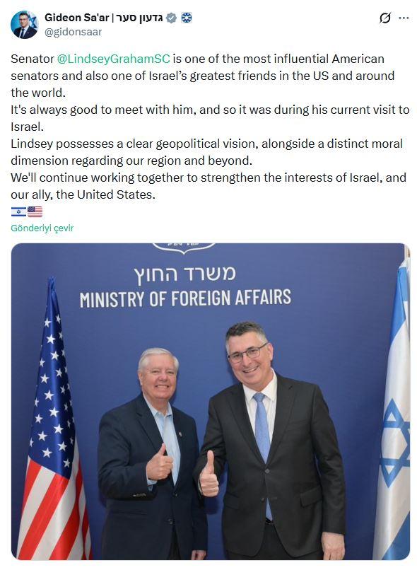 ABD'li Senatör Graham ise görüşme sonrası X hesabından, Bakan Saar’ın İsrail halkı için büyük işler yaptığını savundu.