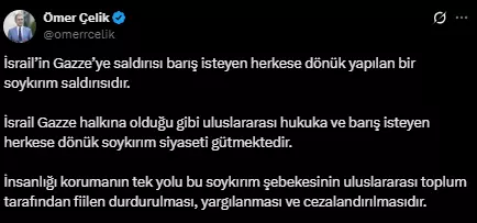 AK PARTİ SÖZCÜSÜ ÇELİK: İSRAİL, BARIŞ İSTEYEN HERKESE DÖNÜK SOYKIRIM SİYASETİ GÜTMEKTEDİRAK Parti Sözcüsü Ömer Çelik ise, "İsrail, Gazze halkına olduğu gibi uluslararası hukuka ve barış isteyen herkese dönük soykırım siyaseti gütmektedir." açıklamasında bulundu. Çelik, sosyal medya üzerinden yaptığı açıklamada, "İsrail'in Gazze'ye saldırısının barış isteyen herkese dönük bir soykırım saldırısı olduğunu belirten Çelik, şunları kaydetti: "İsrail, Gazze halkına olduğu gibi uluslararası hukuka ve barış isteyen herkese dönük soykırım siyaseti gütmektedir. İnsanlığı korumanın tek yolu bu soykırım şebekesinin uluslararası toplum tarafından fiilen durdurulması, yargılanması ve cezalandırılmasıdır." ifadelerini kullandı.