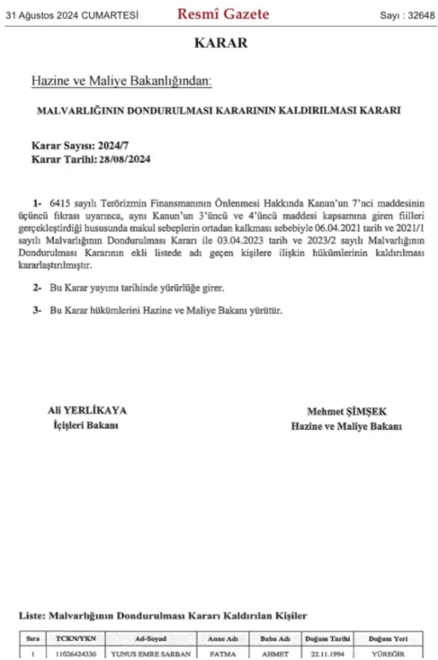 IŞİD TEDBİRİ 2024'TE KALDIRILMIŞSarban'ın malvarlığı üzerindeki tedbirin ise, 31 Ağustos 2024 tarihli, 32648 Sayılı Resmi Gazete'de yayımlanan karar "Makul sebeplerin ortadan kalktığı" gerekçesiyle kaldırıldığı görüldü.