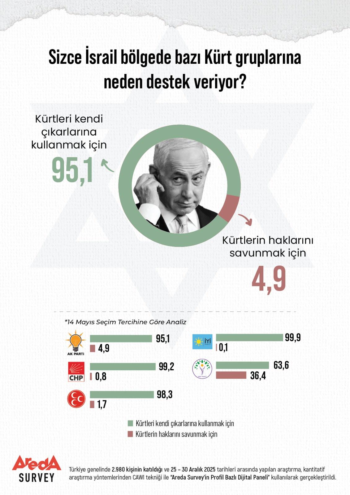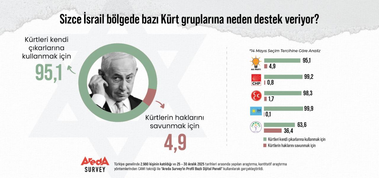Areda Survey tarafından 25–30 Aralık 2025 tarihleri arasında Türkiye genelinde 2.980 kişinin katılımıyla gerçekleştirilen araştırmaya göre, Türk halkının yüzde 95,1’i İsrail’in bazı Kürt gruplarını kendi çıkarları için desteklediğini düşünüyor. Yüzde 4,9’u ise İsrail’in desteğini Kürtlerin haklarını savunmaya yönelik olduğu kanaatini taşıyor.