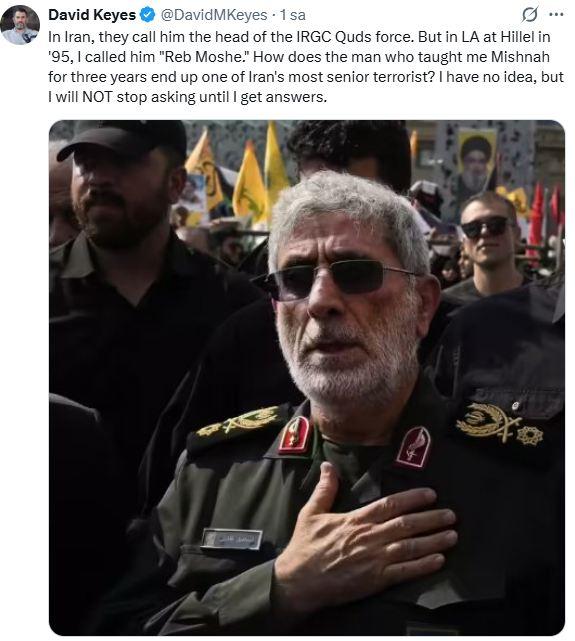 KAFA KARIŞTIRAN SÖZLER Bu gelişmelerin ışığında İsrail asıllı insan hakları aktivisti David Keyes, İsmail Kaani için dikkat çeken bir çıkışa imza attı. Kaani ile ilişkilerinin 1995 yılına dayandığını ifade eden David Keyes, "İran'da ona Devrim Muhafızları Kudüs Gücü'nün başı diyorlar. Ama 1995'te Los Angeles'taki Hillel'de ona 'Reb Moshe' derdim. Bana üç yıl boyunca Mişna öğreten adam nasıl olur da İran'ın en üst düzey teröristlerinden biri olur? Hiçbir fikrim yok, ama cevap alana kadar sormaya devam edeceğim" ifadelerini kullandı.