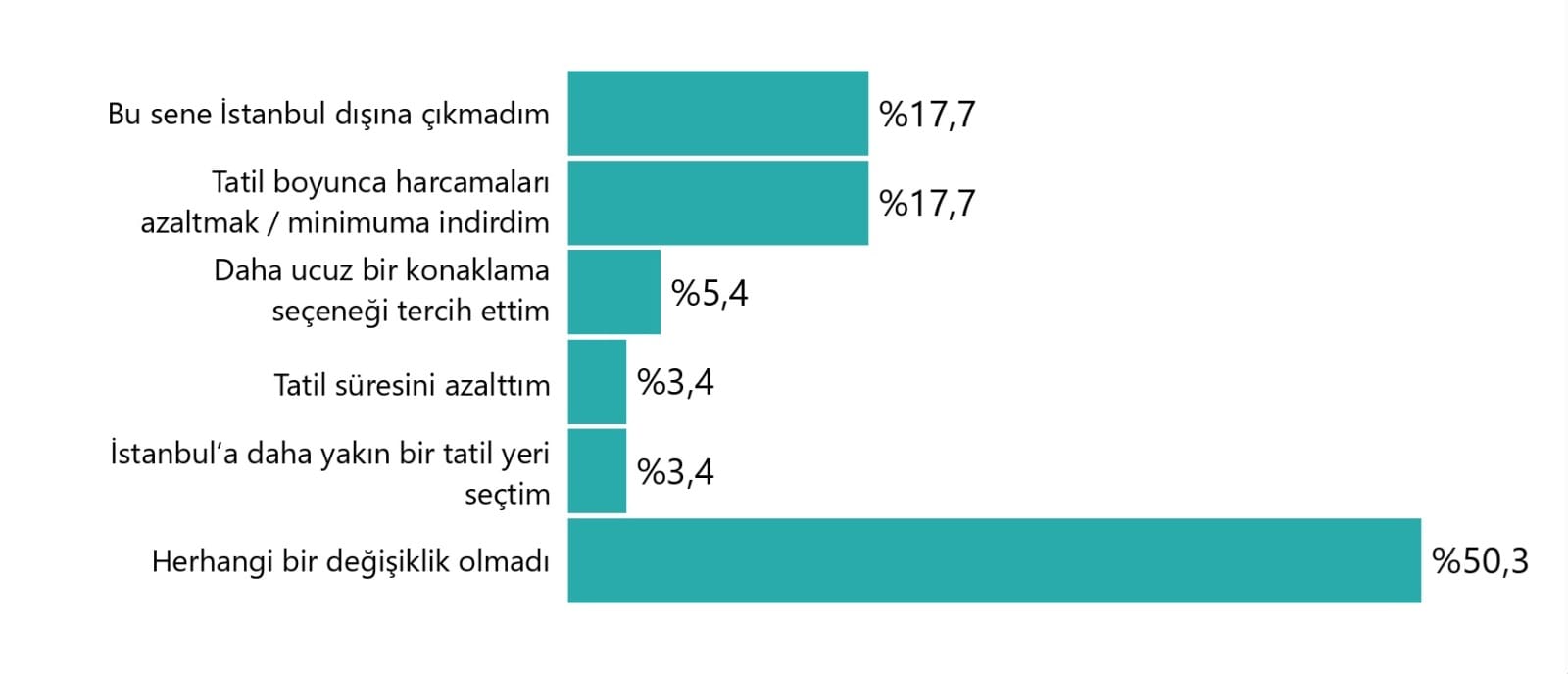 Ramazan Bayramı tatiline ilişkin veriler, tatilin bile artık bir lüks haline geldiğini gösterdi. Normal şartlarda bayramı İstanbul dışında geçirenlerin %17,7’si bu yıl ekonomik gerekçelerle şehirde kalmak zorunda olduğunu belirtti. Bayram süresince harcamalarını kısmak zorunda kalanların oranı da yine %17,7 olarak kayıtlara geçti.