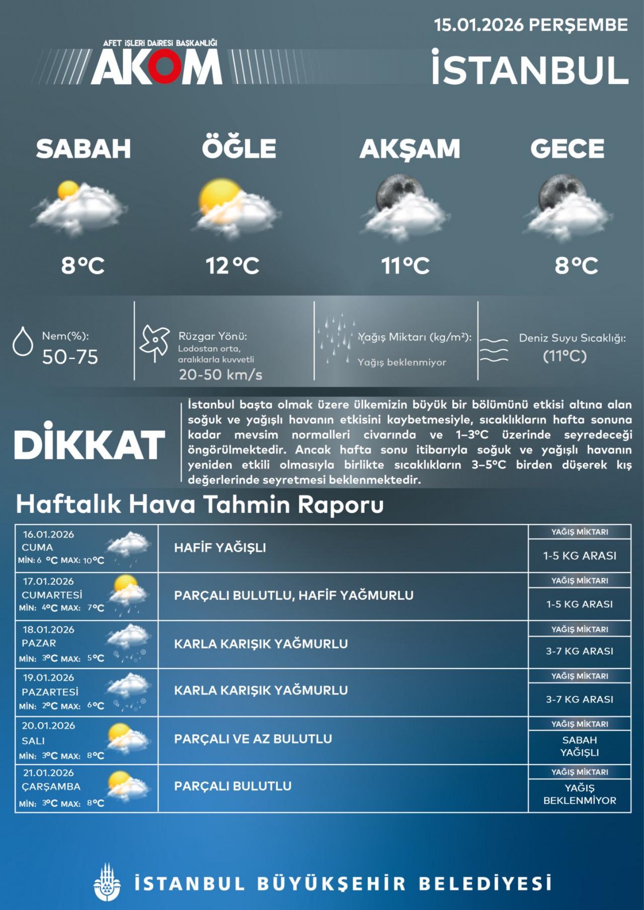 AKOM'dan yapılan açıklamada, "İstanbul başta olmak üzere ülkemizin büyük bir bölümünü etkisi altına alan soğuk ve yağışlı havanın etkisini kaybetmesiyle, sıcaklıkların hafta sonuna kadar mevsim normalleri civarında ve 1–3°C üzerinde seyredeceği öngörülmektedir. Ancak hafta sonu itibarıyla soğuk ve yağışlı havanın yeniden etkili olmasıyla birlikte sıcaklıkların 3–5°C birden düşerek kış değerlerinde seyretmesi beklenmektedir." ifadelerine yer verildi.