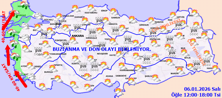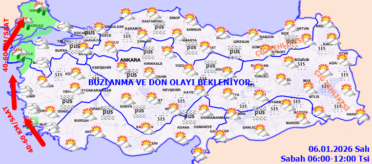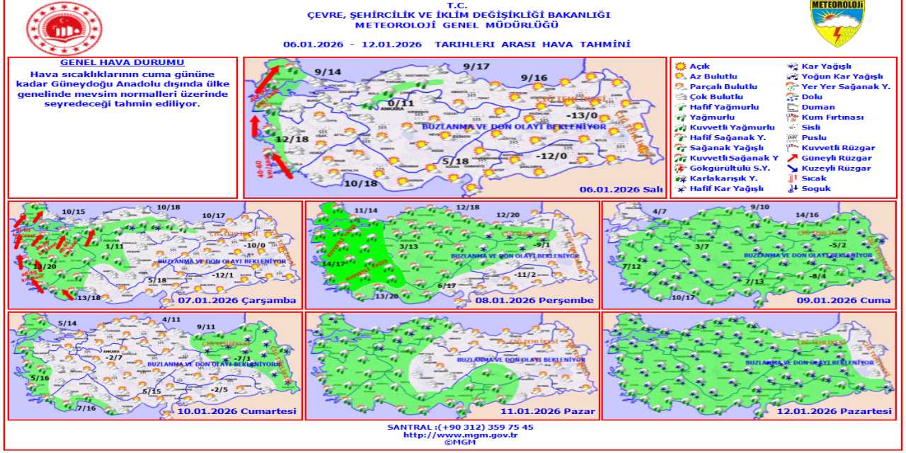 BUZLANMA VE DON OLAYI UYARISI: Ülkemizin kuzey, iç ve doğu kesimlerinde buzlanma ve don olayı beklendiğinden yaşanabilecek olumsuzluklara karşı dikkatli ve tedbirli olunması gerekmektedir.