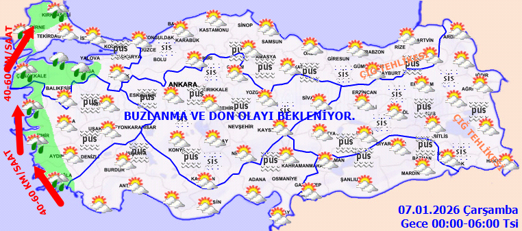 İç ve doğu bölgelerde buzlanma ve don ile birlikte pus ve yer yer sis olayı beklenirken Doğu Karadeniz’in iç kesimlerinin yüksekleri ile Doğu Anadolu’nun doğusunda yüksek kar örtüsüne sahip eğimli kesimlerinde bulunan çığ tehlikesine karşı vatandaşların dikkatli olması konusunda uyarılar yapıldı.