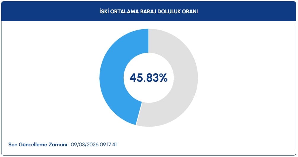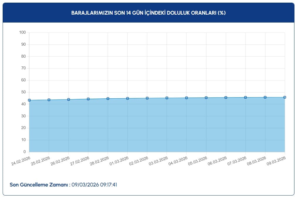 6 Mart 2026: yüzde 45,627 Mart 2026: yüzde 45,628 Mart 2026: yüzde 45,829 Mart 2026: yüzde 45,83Veriler, son yağışların barajlara bir miktar katkı sağladığını ortaya koysa da artışın oldukça düşük seviyede kaldığı görülüyor.