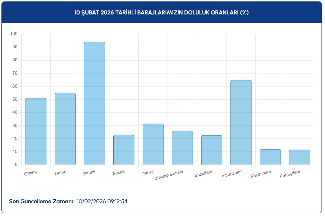 10 ŞUBAT 2026 İSTANBUL BARAJ DOLULUK ORANLARINDA SON DURUMİstanbul’un barajlarındaki doluluk oranları, son sağanak yağışlar ve kar erimelerinin etkisiyle güncellendi. Kent genelinde en yüksek doluluk Elmalı Barajı’nda yüzde 94,21 olarak ölçülürken, en düşük doluluk Pabuçdere Barajı’nda yüzde 11,62 seviyesinde kaydedildi. Bu durum, bazı barajların neredeyse kapasiteye yakın dolarken, bazı havzalarda su seviyesinin hâlâ kritik düzeyde olduğunu gösterdi.