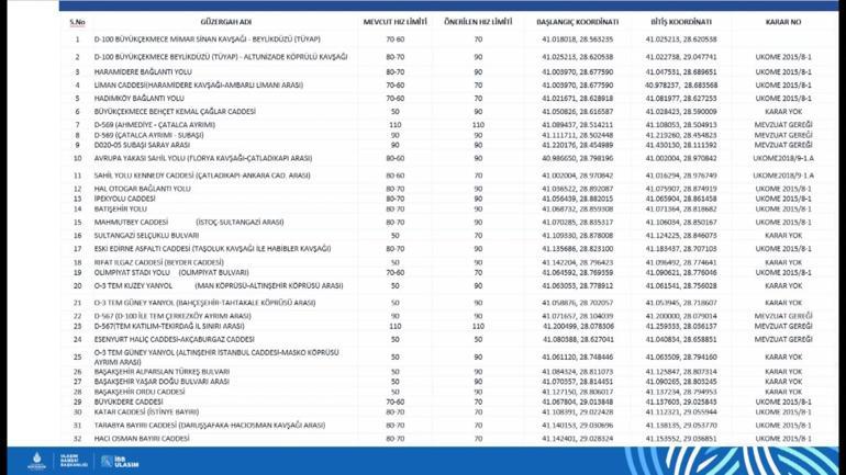 D-100 Büyükçekmece Mimar Sinan Kavşağı- Beylikdüzü (TÜYAP), D-100 Büyükçekmece Beylikdüzü (TÜYAP) - Altunizade Köprülü Kavşağı, D-100 Harem-Tuzla ,D-100 Kartal- Samandıra'da, tünellerde de Sarıyer-Çayırbaşı Tüneli, Avrasya tüneli, Tantavi Tüneli, Vecdi Diker Tüneli, Halit Ulukurt Tüneli'nde hız sınırları yeniden belirlendi.