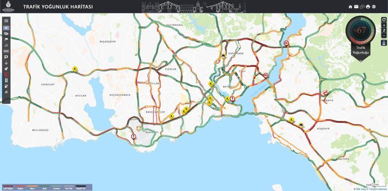 İstanbul'da akşam saatlerinde trafik yoğunluğu oluştu. İstanbul Büyükşehir Belediyesi Trafik Yoğunluğu Haritası verilerine göre saat 19.45 itibariyle yoğunluk yüzde 67'ye ulaştı.