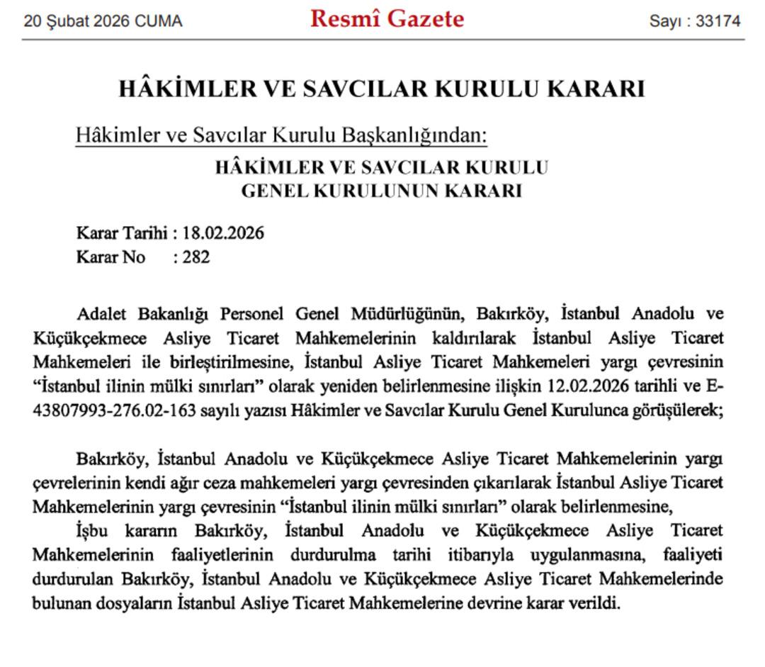 Resmi Gazete'de yayımlanan kararda, "Bakırköy, İstanbul Anadolu ve Küçükçekmece Asliye Ticaret Mahkemeleri yargı çevrelerinin kendi ağır ceza mahkemeleri yargı çevresinden çıkartılarak İstanbul Asliye Ticaret Mahkemelerinin yargı çevresinin 'İstanbul ilinin mülki sınırları' olarak belirlenmiştir" ifadesine yer verildi.