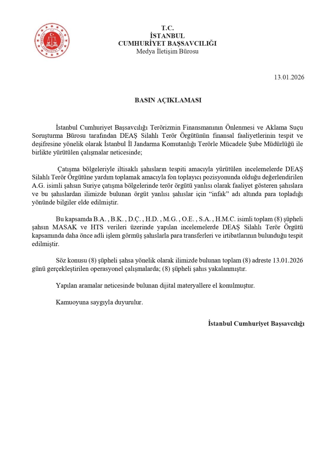 Soruşturma kapsamında B.A., B.K., D.Ç., H.D., M.G., O.E., S.A. ve H.M.C.'nin, MASAK ve HTS verileri üzerinde yapılan incelemelerde terör örgütü IŞİD kapsamında daha önce adli işlem görmüş şüphelilere para transferleri ve irtibatlarının bulunduğu tespitine yer verilen açıklamada, şüphelilerin yakalanmasına yönelik İstanbul'da 8 farklı adrese düzenlenen operasyonlarda 8 şüphelinin gözaltına alındığı, adreslerde yapılan aramalarda ele geçirilen dijital materyallere el konulduğu bildirildi.