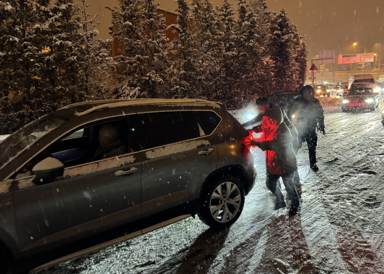 Araçların güçlükle ilerlediği Beykoz'da yolda kalan araçları, vatandaşlar iterek hareket ettirdi.