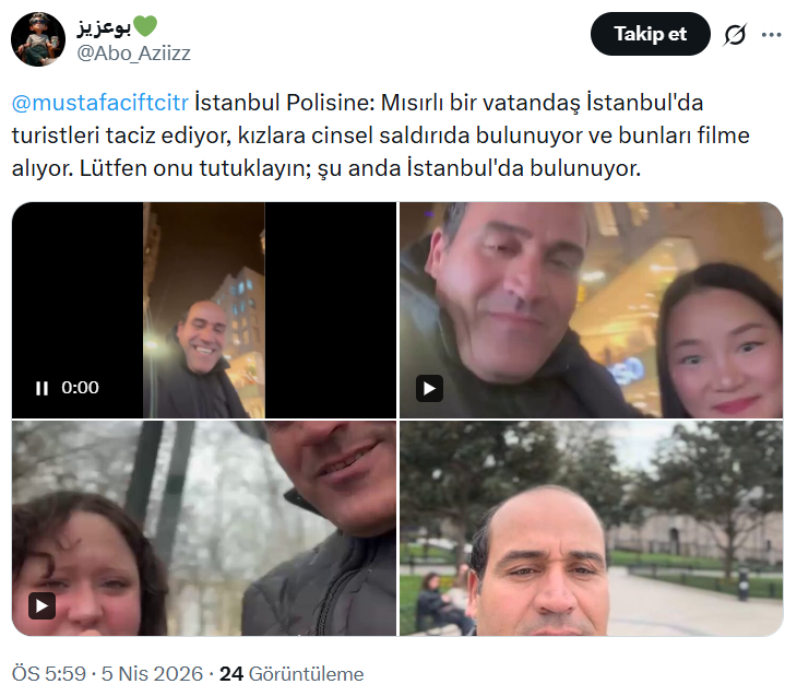 İstanbul'da yaşandığı belirtilen görüntülerde, kendisini "polis yardımcısı" olarak tanıtan Mısır vatandaşı bir kişinin kadınlara yönelik taciz iddiaları büyük yankı uyandırdı.
