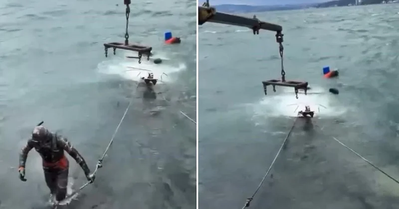 Tekne, vinç yardımıyla denizden çıkarılırken kurtarma çalışmaları çevredekilerin cep telefonu kameralarına yansıdı.