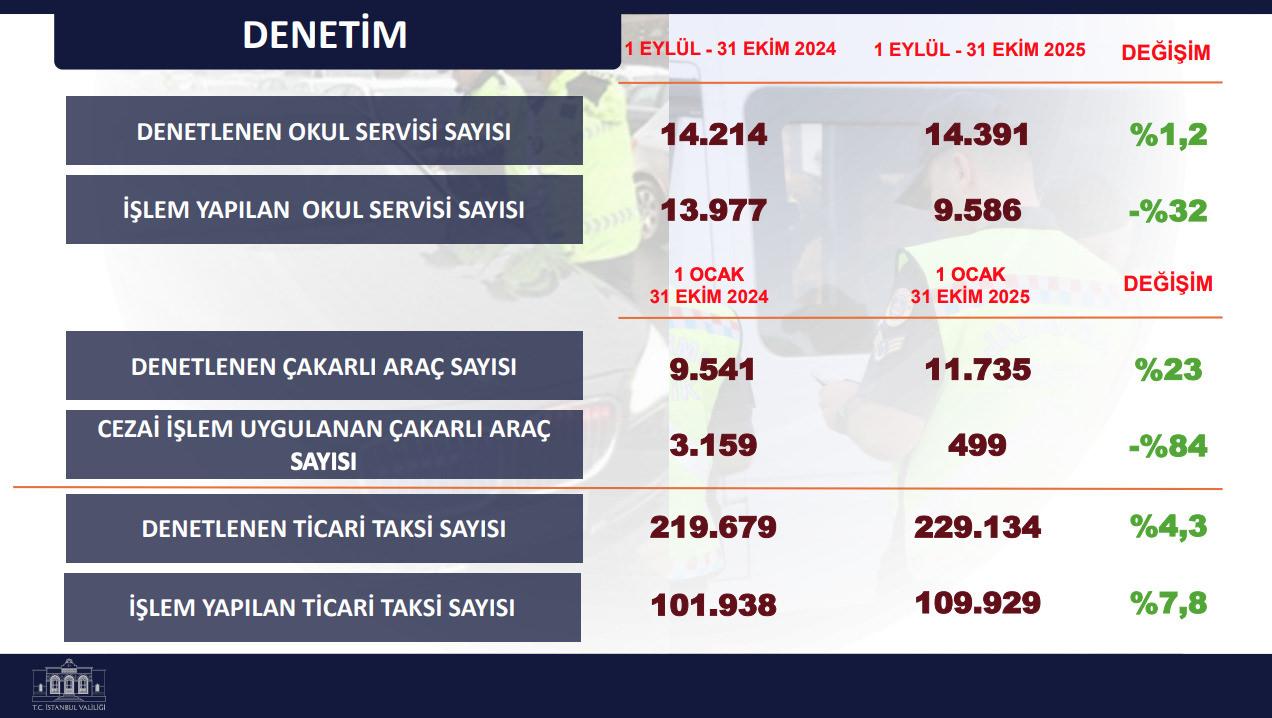 ÇAKARLI ARAÇ, TAKSİ VE OKUL SERVİSİ DENETİMLERİÇakarlı araç denetimleri 2025’in ilk 10 ayında artarken, uygunsuz çakar kullanımına uygulanan cezai işlem sayısı yüzde 84 düştü. Ticari taksilerde yapılan denetimlerde işlem yapılan araç sayısı arttı. Okul servisleri için yapılan son iki aylık denetimde ise işlem yapılan servis oranı yüzde 32 azaldı.