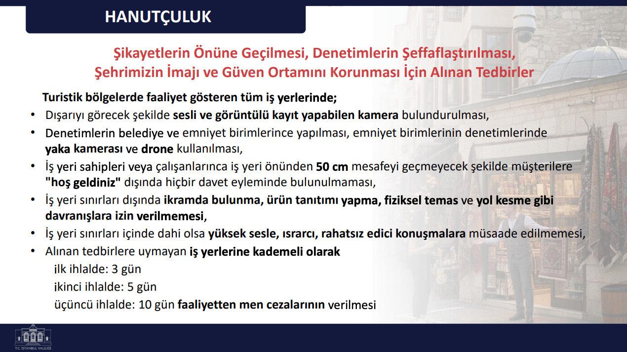 Turistik alanlarda son dönemde artan hanutçuluk şikayetlerinin ardından yeni bir denetim modeli devreye alındı. İş yerlerinde dışarıya dönük kamera zorunluluğu getirildi, denetimlerde yaka kamerası ve drone kullanılmaya başlandı. Müşteri daveti için 50 santimetrelik sınır çizildi; sınır dışına taşan, ısrarcı ve rahatsız edici davranışlara kademeli olarak 3, 5 ve 10 gün faaliyetten men cezası uygulanacağı açıklandı.