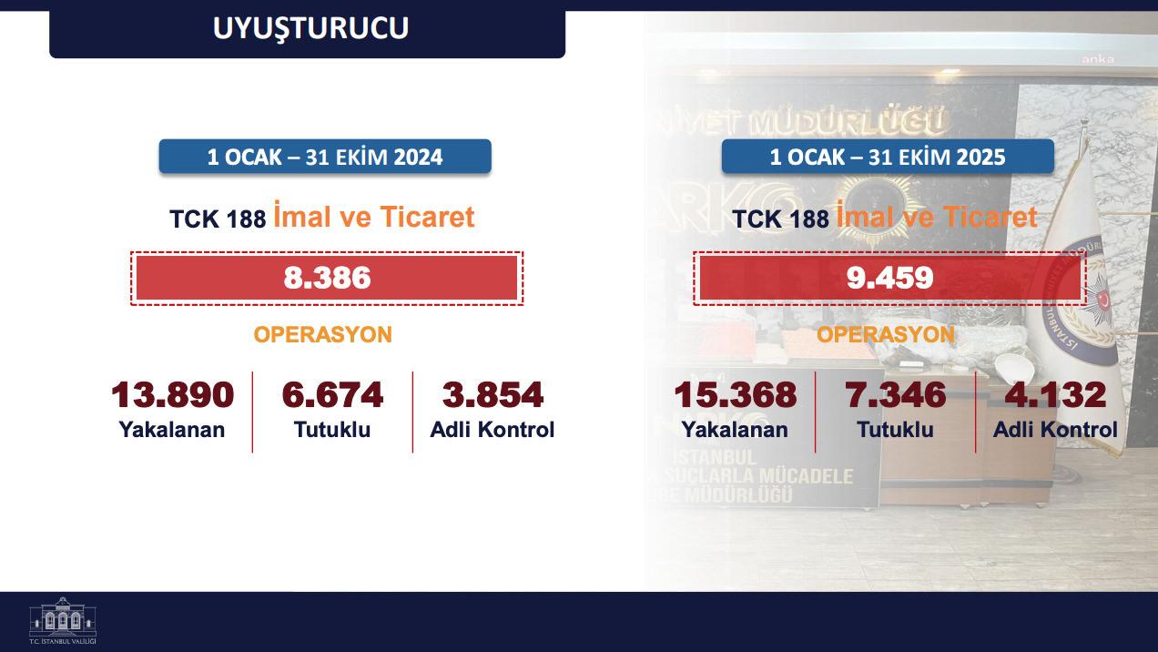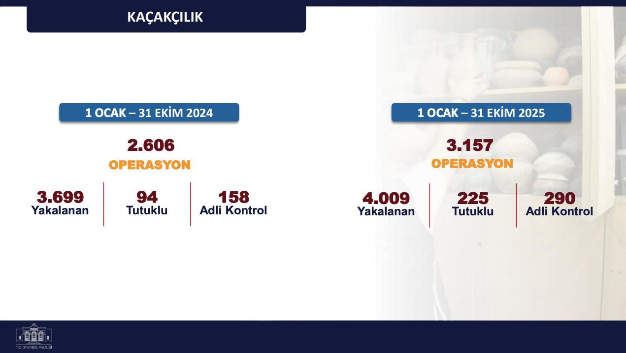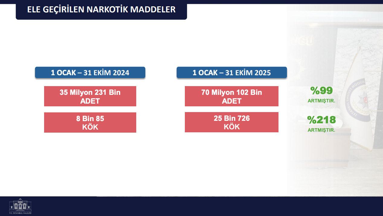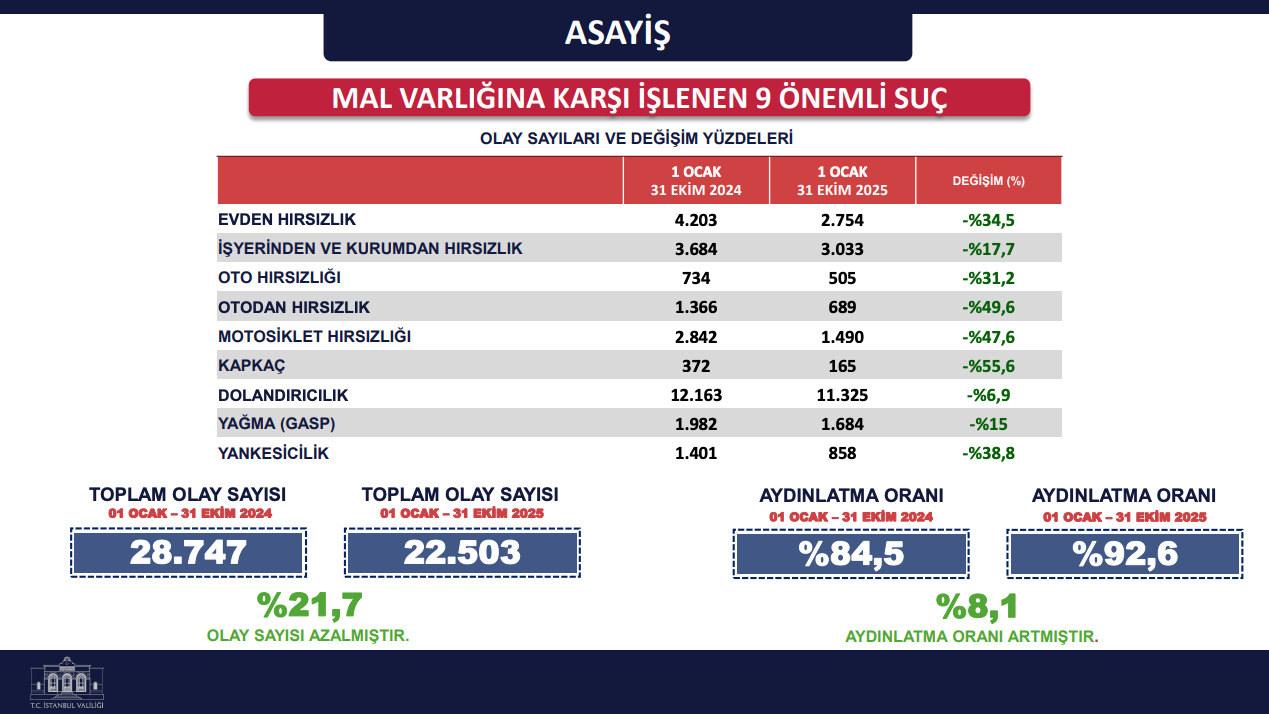 İstanbul Valiliği, 2025 yılının Kasım ayında gerçekleştirdiği Medya Buluşması'nda, kentin 1 Ocak - 31 Ekim tarihleri arasındaki 10 aylık emniyet verilerini kamuoyu ile paylaştı. Valilik tarafından yapılan açıklamada, "İstanbul'umuzun güvenliği, vatandaşlarımızın huzuru en büyük gayemiz" mesajı verilirken, kentteki toplam olay sayılarında önemli bir düşüş yaşandığı ve suç örgütlerine yönelik mücadelede rekor artışlar kaydedildiği belirtildi.