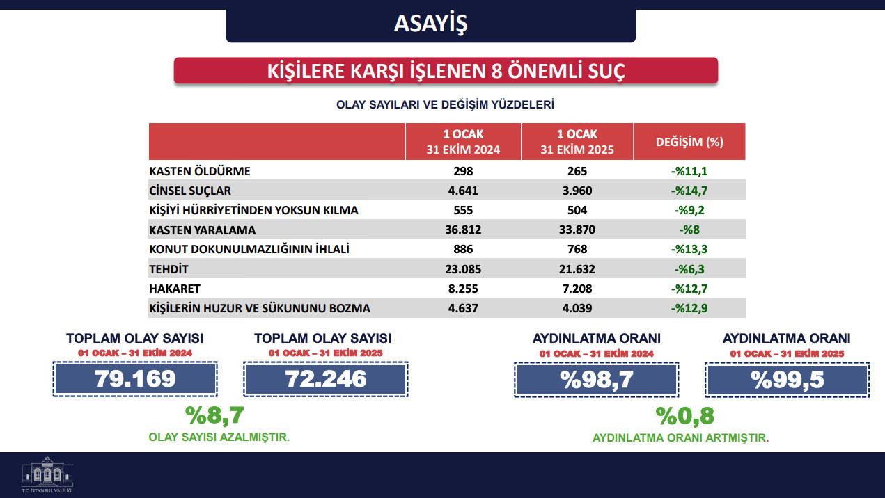 Verilere göre kişilere karşı işlenen sekiz ana suçta toplam olay sayısı bir önceki yıla göre yüzde 8,7 azaldı. Kasten öldürmede yüzde 11,1, cinsel suçlarda yüzde 14,7, konut dokunulmazlığının ihlalinde yüzde 13,3 düşüş yaşandı. Mal varlığına karşı işlenen dokuz suçta ise toplam olay sayısı yüzde 21,7 geriledi.