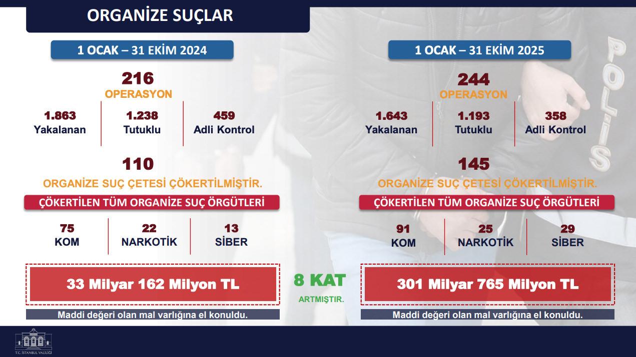 Organize suç çetelerine yönelik operasyonlarda çökertilen çete sayısı yüzde 33 artarak 244’e çıktı. 301 milyar 765 milyon TL değerinde mal varlığına el konuldu. Geçen yıl aynı dönemde bu rakam 33 milyar TL’ydi. El koymada 8 kat artış yaşandı.